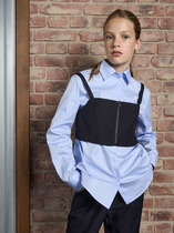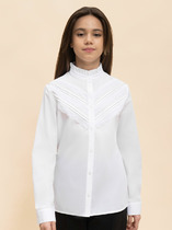 Блузка свободного силуэта. Рукава длинные втачные, с двумя швами. Горловина круглой формы с воротником из поплина. . Сзади изделия застежка - «капелька» на пуговицу d=10mm, петлю жилка вязаная 4 мм,жилка 13797K,KT1-4 . Низ рукавов и изделия обработаны на 2-х игольной плоскошовной машине швом в подгибку.