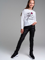 Брюки для девочек свободного силуэта. Пояс отрезной из основного полотна с эластичной тесьмой внутри 50RV. По поясу проложены отделочные строчки. Низ брюк обработан швом в подгибку.