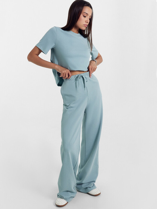 Брюки прямые свободные. Посадка средняя. Пояс цельнокроеный с эластичной тесьмой внутри. С внешней стороны пояса пробиты петли и втянут шнур. В боковых швах обработаны карманы. Подкладка карман из основного полотна. Нижние срезы обработаны швом вподгибку.