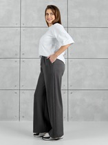Ультрамодные женские брюки из капитона – трикотажного полотна с необычной "стеганой" фактурой. Силуэт брюки свободный, оверсайз. Пояс с эластичной тесьмой внутри. В боковых швах есть карманы. Штанины завершаются манжетами с эластичной тесьмой. Красиво и удобно!