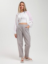 Брюки прямого силуэта из трикотажного полотна. Посадка по талии высокая. Пояс с эластичной тесьмой внутри и регулировочным шнуром. Сиденье слегка спущено. Брюки дарят особый комфорт и свободу движений!