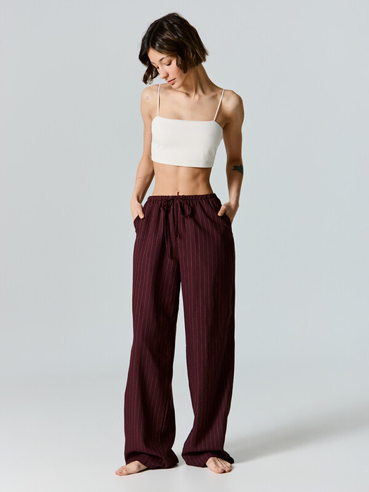 Брюки с посадкой на талии свободного силуэта. Пояс цельнокроеный с резиной внутри. По центру пояса пробиты петли, протянута бейка из основного полотна. На передних деталях карманы "хулиганы".   Низ изделия застрочен швом в подгибку.