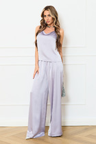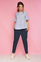 Брюки женские прямого силуэта из ткани. На деталях переда карманы с отрезным бочком. Пояс отрезной состоит из двух частей, задняя часть пояса присборена на резинку. Посадка средняя.