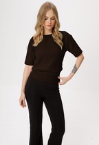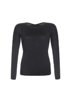 Джемпер прилегающего силуэта. Горловина V-образной формы. Центральная застежка на завязки. Рукав втачной, длинный. Низ блузки и рукавов обработан на микрооверлоке.