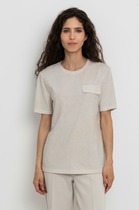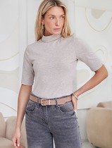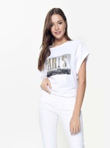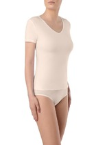 Футболка женская свободного силуэта из трикотажного кулирного пототна. Горловина круглой формы, с широкой обтачкой из рибаны. Плечо спущено, пройма углублена. Рукав втачной, длиной по локоть. Подгибка низа и рукавов широкая.