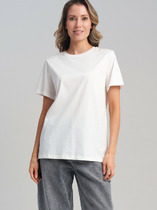 Эта женская футболка станет незаменимой базовой моделью в вашем гардеробе. Прямой и свободный крой обеспечивает комфорт и свободу движений. Круглая форма горловины и короткие рукава делают её универсальной и подходящей для любого случая. Изделие выполнено из хлопковой кулирки, гарантирующей мягкость и приятное ощущение на коже. Эта футболка идеально сочетается с различными элементами гардероба, создавая стильные и удобные образы на каждый день.