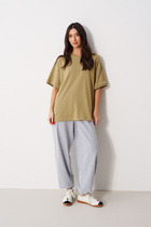 Удлиненный крой, свободная посадка и спущенная линия плеч создают расслабленный образ и подчеркивают актуальность модели. Широкие рукава длиной чуть выше локтя добавляют объема и свободы движений.