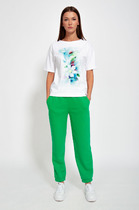 Футболка силуэта оверсайз из трикотажного полотна кулирка. Горловина круглой формы, обтачка горловины из рибаны. Шов горловины спинки закрыт бейкой из основного полотна.