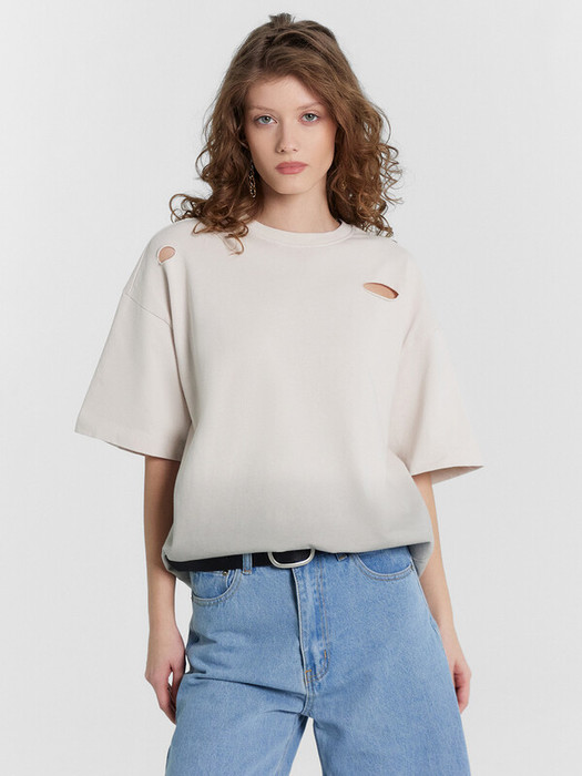 Футболка силуэта оверсайз из трикотажного полотна кулирка. Горловина круглой формы, обтачка горловины из рибаны. Шов горловины спинки закрыт бейкой из основного полотна.