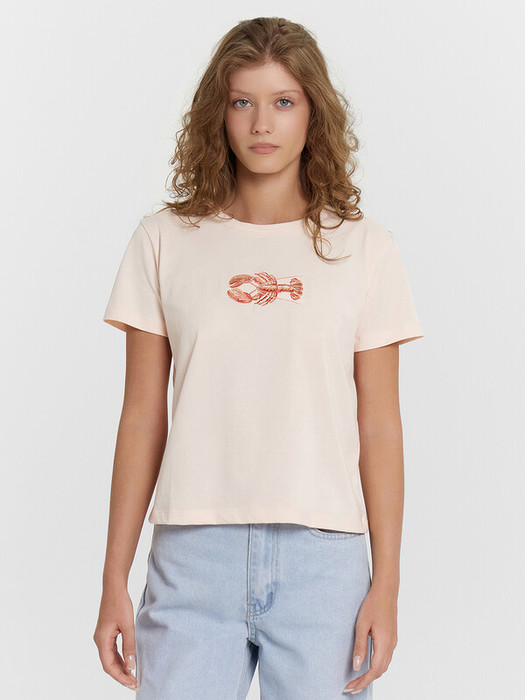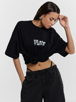 Футболка прямого силуэта, укороченная. Горловина круглой формы обработана бейкой в 3 сложения из основоного полотна. Рукава втачные, корткие. Нижние срезы футболки и рукавов обработаны швом вподгибку.