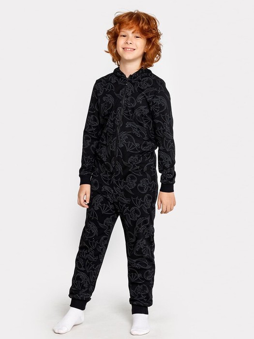 Детский комбинезон из трикотажного интерлока. Комфортный свободный силуэт, уютный капюшон с декоративными ушками из мехового полотна, удобная застежка-молния по центру. Длинные рукава завершаются широкими манжетами, как и штанины. Универсальный домашний комбинезон!