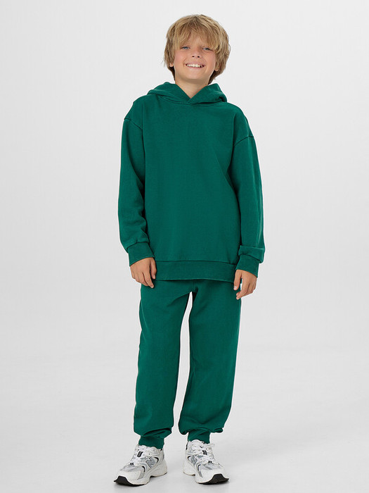 Худи свободного силуэта для мальчиков с капюшоном. Горловина округлой формы. Капюшон со средним швом, на подкладке из основного полотна. Плечо спущено, рукав втачной длинный. По низу рукава отрезная манжета из рибаны. Пояс отрезной из рибаны.Брюки для мальчиков. Без бокового шва. Карманы в вытачке. Пояс отрезной с внутренней эластичной тесьмой. Пояс прострочен двумя отделочными строчками. Внутри в пояс втянут шнур. Низ брюк обработан манжетами из рибаны.