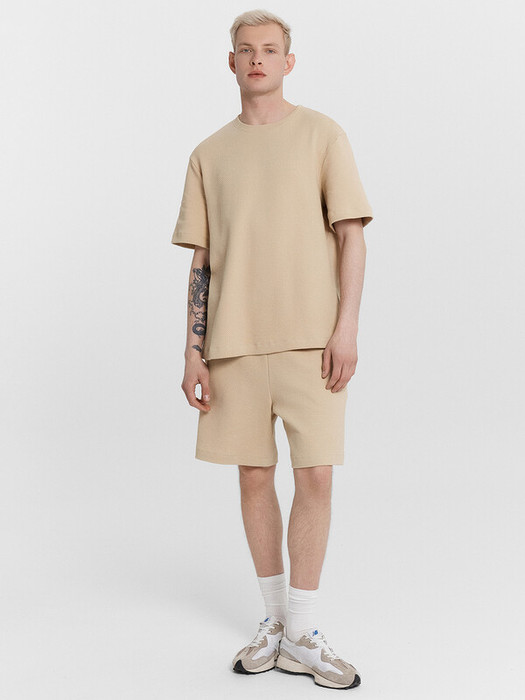 Комплект изготовлен из трикотажного полотна интерлок. Футболка свободная, прямого силуэта. Длина до линии бедер.