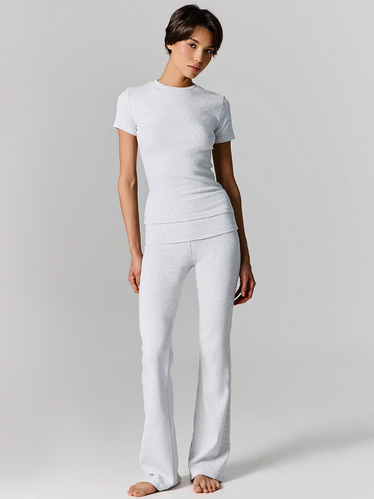 Комплект состоит из джемпера и брюк. Джемпер прилегающего силуэта. Горловина круглой формы обработана обтачкой из основного полотна, шов втачивания обтачки по спинке закрыт бейкой из основного полотна. Рукава втачные короткие. Нижний срез джемпера и рукавов обработан швом вподгибку. Брюки клеш, посадка средняя. Пояс отрезной широкий с отворотом. По шву втачивания отворота в припуск вставлена эластичная тесьма 6мм (жилка тканая WT4-6 Arteks  E7112). Нижний срез брюк обработан швом вподгибку.