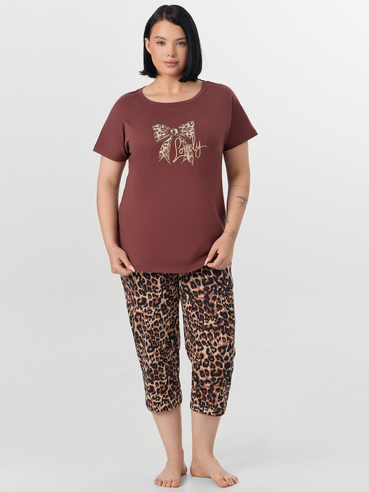Коричневый домашний комплект с леопардовым принтом создан для моментов полного расслабления. Основное преимущество — полностью натуральный материал: хлопок в составе обеспечивает комфорт в любое время года. Плотная, но мягкая ткань обладает хорошей воздухопроницаемостью и помогает поддерживать оптимальную температуру тела. Футболка свободного кроя с округлой горловиной и бриджи на мягкой резинке обеспечивают полную свободу движений, не сковывая и не ограничивая вас даже во время сна. Плоские внутренние швы и эластичные манжеты не создают давления и дискомфорта. Качественный хлопок устойчив к многократным стиркам, сохраняя форму и насыщенность цвета, оставаясь приятным к телу.