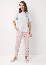 Комплект женский состоит из футболки и шорт. Футболка свободного силуэта. Горловина круглой формы, обтачка из основного полотна. Рукава втачные свободные, линия плеча слегка спущена. Низ рукавов и футболки в подгибку.