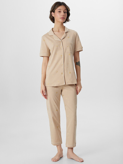 Джемпер прямого силуэта дополнен накладным карманом и застежкой на пуговицы. Короткие рукава с аккуратными манжетами и кантом подчеркивают внимание к деталям. Женская пижама с бриджами на эластичном поясе обеспечивает полную свободу движений, не сковывая даже во время сна. Мягкая резинка внутри пояса бережно фиксирует изделие на талии.