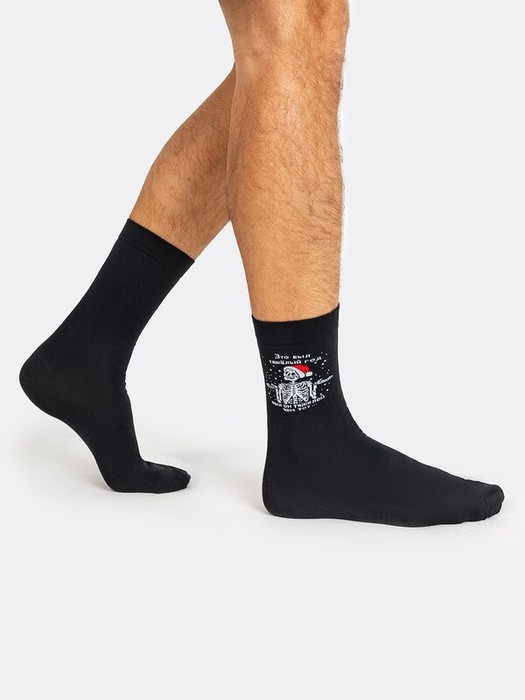 рис.2601   Классический гладкий мужской носок с узким бортом и рисунком в виде скелета в новогодней шапке.