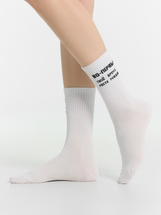 рис.3051 Женский носок с высоким плотным бортом, и рисунком в виде надписи "Во первых: твое время и место рождения".