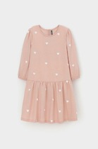 Платье полуприлегающего силуэта с отрезной юбкой. Длина выше колена. Горловина круглая, окантована бейкой из основного полотна. Рукав втачной длинный. Низ рукава обработан на 2-х игольной плоскошовной машине. Юбка трехслойная на сборке. Верхние два слоя из трикотажного полотна сетки, подкладка из трикотажного кулирного полотна. Пояс из жаккардовой тесьмы