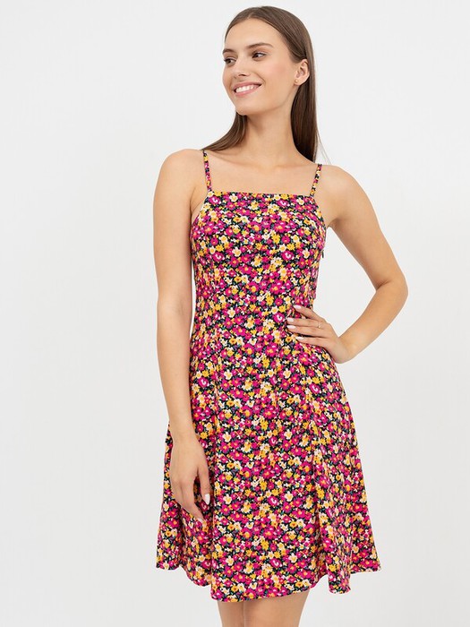 Платье изготовлено из текстильного полотна. Платье на  бретельках полуприлегающего силуэта, длиной до колен. Перед и спинка с вертикальными рельефами. В левом боковом шве обработана застежка на потайную молнию. Верхний срез лифа обработан обтачкой из осн. полотна. Низ платья обработан швом вподгибку.