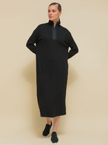 Прилегающее женское платье длиной ниже колена. Выполнено из трикотажной рибаны – в рубчик. Вырез круглый, с чуть удлиненным воротником. Рукава узкие, слегка удлиненные. От линии бедер платье расширяется и завершается асимметричным нижним краем. Красиво!
