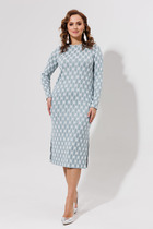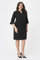 Платье полуприлегающего силуэта из ткани рошель. Горловина V-образной формы. Платье отрезное по талии, с эластичной тесьмой внутри. По эластичной тесьме проложены отделочные строчки. По детали переда средний шов. Детали спинки со средним швом. Рукав втачной, длинный. По окату слегка присборен. Длина рукава 3\4, по низу рукава настрочена эластичная тесьма которая делает сборку. Низ платья расширяется к низу. Длина платья ниже колена.