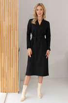 Платье полуприлегающего силуэта из ткани рошель. Горловина V-образной формы. Платье отрезное по талии, с эластичной тесьмой внутри. По эластичной тесьме проложены отделочные строчки. По детали переда средний шов. Детали спинки со средним швом. Рукав втачной, длинный. По окату слегка присборен. Длина рукава  3\4, по низу рукава настрочена эластичная тесьма которая делает сборку. Низ платья расширяется к низу. Длина платья ниже колена.