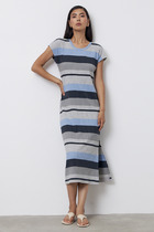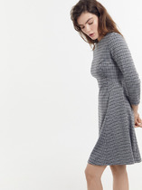 Платье полуприлегающего силуэта из ткани рошель. Горловина V-образной формы. Платье отрезное по талии, с эластичной тесьмой внутри. По эластичной тесьме проложены отделочные строчки. По детали переда средний шов. Детали спинки со средним швом. Рукав втачной, длинный. По окату слегка присборен. Длина рукава  3\4, по низу рукава настрочена эластичная тесьма которая делает сборку. Низ платья расширяется к низу. Длина платья ниже колена.
