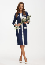 Платье полуприлегающего силуэта из ткани рошель. Горловина V-образной формы. Платье отрезное по талии, с эластичной тесьмой внутри. По эластичной тесьме проложены отделочные строчки. По детали переда средний шов. Детали спинки со средним швом. Рукав втачной, длинный. По окату слегка присборен. Длина рукава  3\4, по низу рукава настрочена эластичная тесьма которая делает сборку. Низ платья расширяется к низу. Длина платья ниже колена.