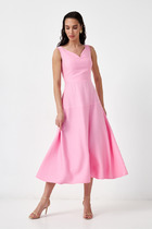 Платье из интерлока облегающего силуэта без рукавов.Глубокая горловина каре по переду и спинке. Горловина и проймы обработаны бейкой их кулирного полотна в цвет швом «в чистый край». Узкое плечо. Перед цельнокроенный. Спинка со средним швом, припуски которого расстрочены. В низу шва обработан разрез. Длина изделия по колено. Низ изделия обработан швом вподгибку на плоскошовной машине.
