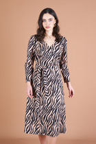 Платье женское прямого силуэта из трикотажного полотна селаник. Горловина круглой формы, с притачным воротником с отрезной стойкой из поплина и застежкой на пуговицу. Плечо слегка спущено, пройма углублена. Рукав втачной, длинный, по низу с отрезной манжетой из селаника. Платье длиной чуть выше колена.