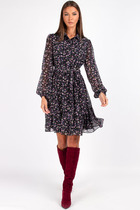 Платье женское прямого силуэта из  трикотажного полотна селаник. Горловина круглой формы, с  притачным воротником с отрезной стойкой из поплина и застежкой на пуговицу. Плечо слегка спущено, пройма углублена. Рукав втачной, длинный, по низу с отрезной манжетой из селаника. Платье длиной чуть выше колена.