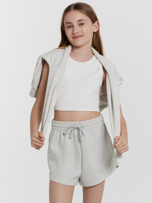 Шорты для девочек. Шорты укороченные, с высокой посадкой. Пояс цельнокроеный с эластичной тесьмой внутри.  Снаружи пробиты петли и втянут шнур 8PXС-2.  В боковых швах кант из трикотажного кулирного полотна. Нижние срезы шорт обработаны швом в подгибку.