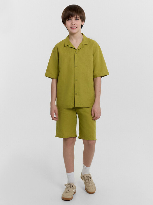 Шорты для мальчиков из ткани. Шорты с классической линией талии. Силуэт прямой. Пояс отрезной. Боковые швы перенесены вперед. Карманы в боковых швах. На внутренней стороне пояса пробиты петли, втянут шнур из основного полотна. Низ шорт обработан швом в подгибку.