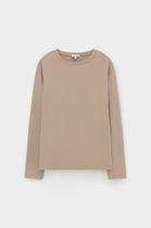 Свитшот прямой, свободный. Горловина круглой формы обработана обтачкой из рибаны. Рукава втачные длинные, с отрезными манжетами. Плечо спущено. По низу отрезной пояс. Пояс и манжеты из рибаны.