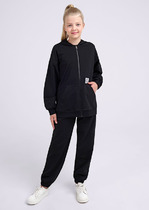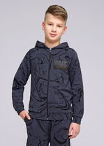 Жакет свободного кроя. Боковые швы к низу перенесены вперед. Круглый вырез горловины. В горловину втачан воротник-стойка из рибаны. Плечо спущено, пройма углубленна. Рукава втачные, длинные. По низу рукавов манжеты из рибаны. В боковых швах карманы . По низу изделия отрезной пояс из рибаны.