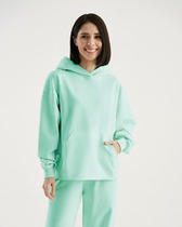 Толстовка прямая свободная, оверсайз. Горловина округлой формы с капюшоном. Капюшон цельнокроеный с подкладкой. На внешней стороне пробиты петли и втянут  шнур (8EKXWC-1 8мм с эглетами). Шов втачивания