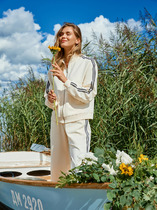 Модель отличается продуманными деталями: удобный воротник-стойка из эластичной рибаны мягко облегает шею, не натирая кожу. Длинные рукава заканчиваются манжетами из той же рибаны, обеспечивая комфортную посадку. Яркие лампасы из кулирки проходят по всей длине рукава, переходя на плечо, добавляя образу спортивный шик.