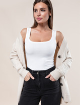 Горловина и проймы окантованы бейками из основного полотна переходящими в бретель.