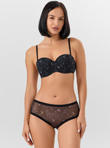 Трусы женские, средняя линия  талии, силуэт - липы. Передняя и задняя центральные детали выполнены из хлопка. Боковые детали из сетки (без боковых швов). Верхний срез трусов обработан жилкой. Нижние срезы трусов обработаны жилкой 6мм. Верхний срез подкладки ластовицы отлетной.