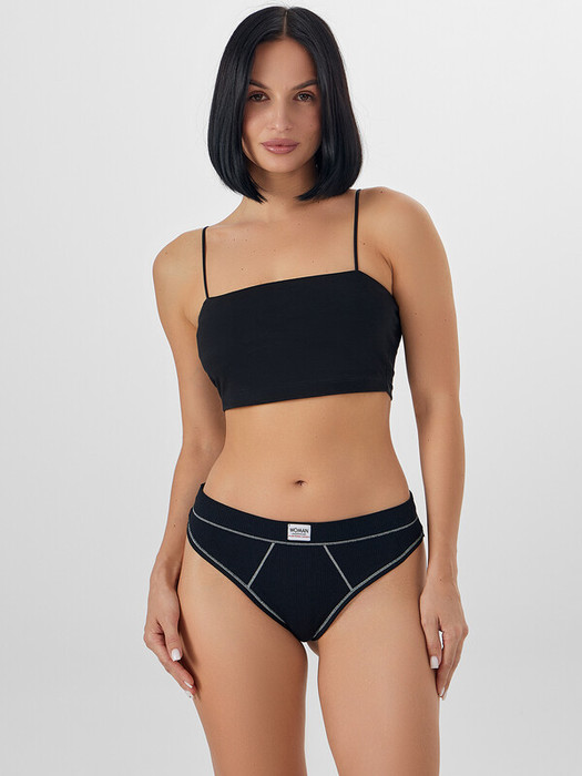 Трусы женские, средняя линия  талии, силуэт - бразилиано. Передняя и задняя детали выполнены из рибаны. Верхний срез трусов обработан бейкой поперечной из рибаны, внутри жилка 6мм. Нижние срезы обработаны бейками поперечными из рибаны. Подкладка ластовицы из хлопка, верхний срез ластовицы притачан к детали из рибаны (с изнаночной стороны имитация мужского гульфика, с лицевой стороны декоративные строчки).