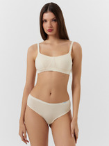 Трусы женские, средняя линия  талии, силуэт - бразилиано. Передняя и задняя детали выполнены из рибаны. Верхний срез трусов обработан бейкой поперечной из рибаны, внутри жилка 6мм. Нижние срезы обработаны бейками поперечными из рибаны. Подкладка ластовицы из хлопка, верхний срез ластовицы притачан к детали из рибаны (с изнаночной стороны имитация мужского гульфика, с лицевой стороны декоративные строчки).