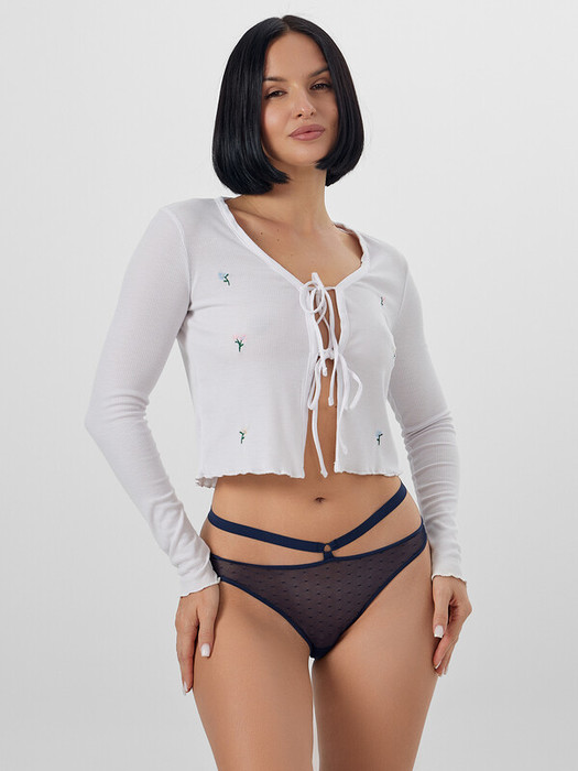 Трусы женские классического силуэта со средней посадкой из эластичной сетки. Передняя и задняя детали  цельные. Подкладка ластовицы из кулирной глади, настрочена по переднему краю. По центру к передней детали прикреплена через кольцо декоративная эластичная тесьма. Талия  и ножки обработаны  эластичной тесьмой по лицевой стороне (жилка).