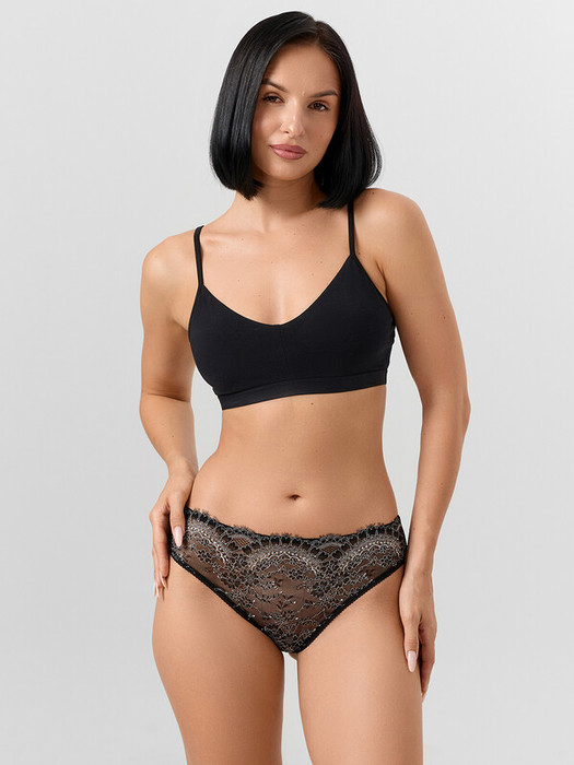 Трусы женские, посадка средняя, силуэт - классика. Трусы выполнены из эластичного кружева. Передняя деталь цельная. Задняя со средним швом. Ластовица отрезная. Подкладка ластовицы выполнена из кулирного полотна.