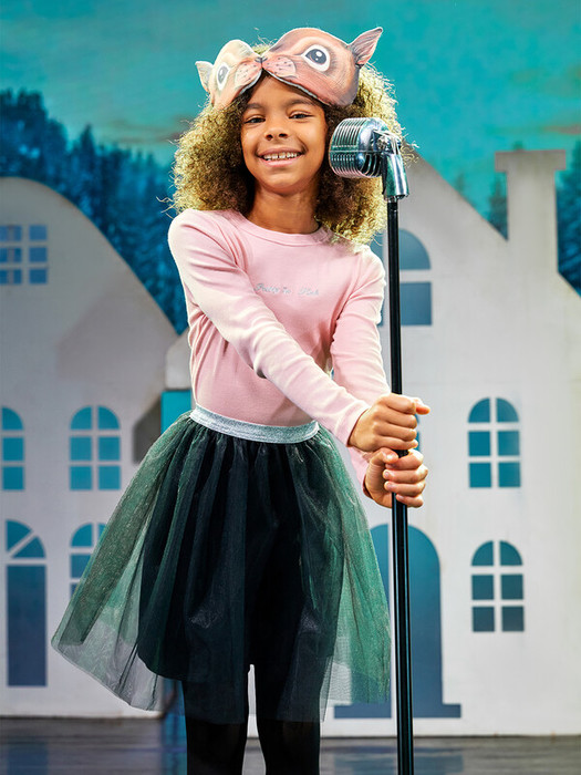 Юбка трехслойная пышная на сборке. Длина выше колена. Верхний слой из трикотажного полотна сетки с пайетками, средний слой из трикотажного основовязаного полотна сетки, нижний слой из полотна трикотажного кулирного. Нижний слой короче. Пояс из жаккардовой тесьмы.
