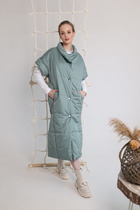Стильная жилетка из легкого трикотажного футера. Силуэт модели прямой и свободный. Есть просторный уютный капюшон. Спущенная линия плеча дарит особый комфорт. Изюминкой модели является вместительный карман-кенгуру. По нижнему краю проходит широкий пояс из рибаны. Стильный жилет для комфортных городских образов!