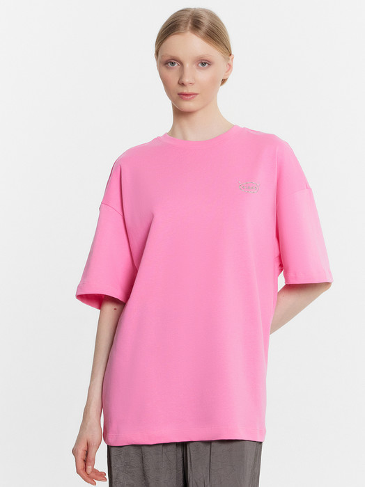 Футболка силуэта оверсайз из трикотажного полотна кулирка. Горловина круглой формы, обтачка горловины из рибаны. Шов горловины спинки закрыт бейкой из основного полотна.