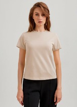 Нижние срезы футболки и рукавов обработаны швом вподгибку.