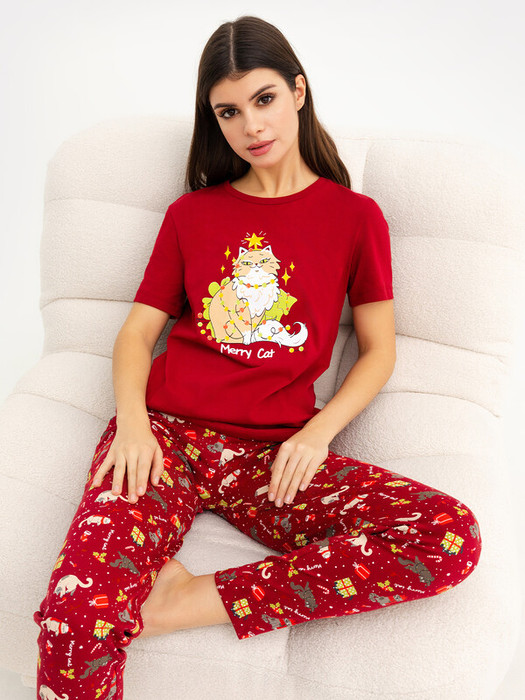 Совместные покупки Сургут Женская одежда Пижамы, халаты — Mark FormelleКОМПЛЕКТ ЖЕНСКИЙ (ФУТБОЛКА, БРЮКИ) 592369 592369 вишневый +коты на